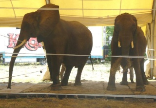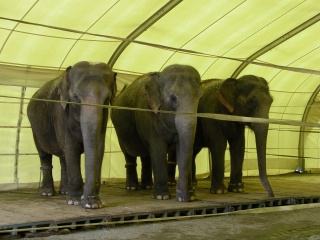 Was die Elefanten angeht, zeigen die Bilder allerdings keine „perfekte Haltung“, sondern verdeutlichen die katastrophalen Bedingungen, die für Zirkuselefanten in Deutschland auch im Jahr 2013 nach den Zirkusleitlinien immer noch erlaubt sind: winzige Paddocks mit Minimal-Einrichtung, die den Elefanten nicht rund um die Uhr, sondern nur einige Stunden am Tag zugänglich sind. Angesichts dieser Mini-Gehege, die einem Elefanten nur wenige Schritte Bewegung ermöglichen und für sinnvolle Strukturierung viel zu klein sind, von „perfekter Haltung“ zu reden, ist blanker Hohn. Den Krone-Elefanten fehlt es an allem, was zur Erfüllung der Grundbedürfnisse einer Elefantenherde in einem Gehege erforderlich ist: Bewegungsfreiheit mit der Möglichkeit, den Artgenossen aus der Sicht zu gehen, Badebecken, Schlammsuhlen und Scheuermöglichkeiten. Es ist ein Armutszeugnis für den Circus Krone, das die Elefanten mindestens 14 - 16 Stunden pro Tag noch viel schlimmere Bedingungen ertragen müssen: Ankettung im Stallzelt an je einem Vorder- und Hinterbein ohne jede Bewegungsfreiheit. Die Folgen dieser Haltung – unzureichende Möglichkeiten zur Selbstpflege, viel zu wenig Bewegung, Frust und ständige Langeweile - sieht man den Krone-Elefanten bereits nach kurzer Beobachtung an, denn alle Tiere zeigen starke Verhaltensstörungen und „weben“ heftig. Hinzu kommen schlechte Bemuskelung und – vor allem bei den beiden Afrikanischen Elefanten – ein sehr schlechter Pflegezustand der Haut. Kein Wunder, dass der Circus Krone „Normalbesuchern“ inzwischen jedes Fotografieren der Elefanten strikt verbietet!